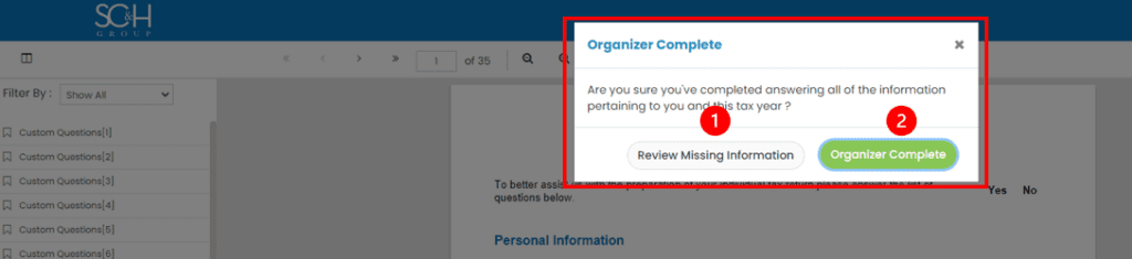- Click Review Missing Information if the organizer is not completed.