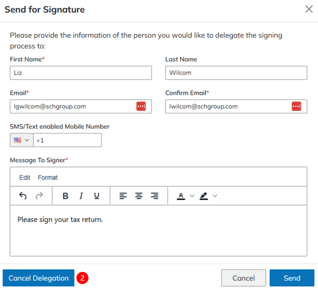 After a return is sent for Signer Delegation, the controller or client can update or cancel the delegation. To update these details, they must click on their access link and authenticate to access the Summary Page.