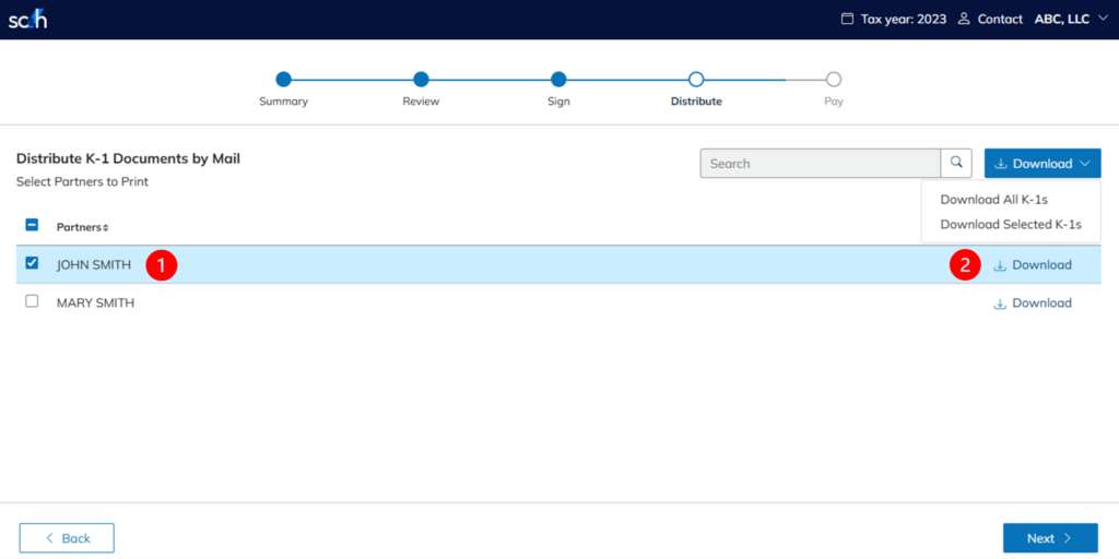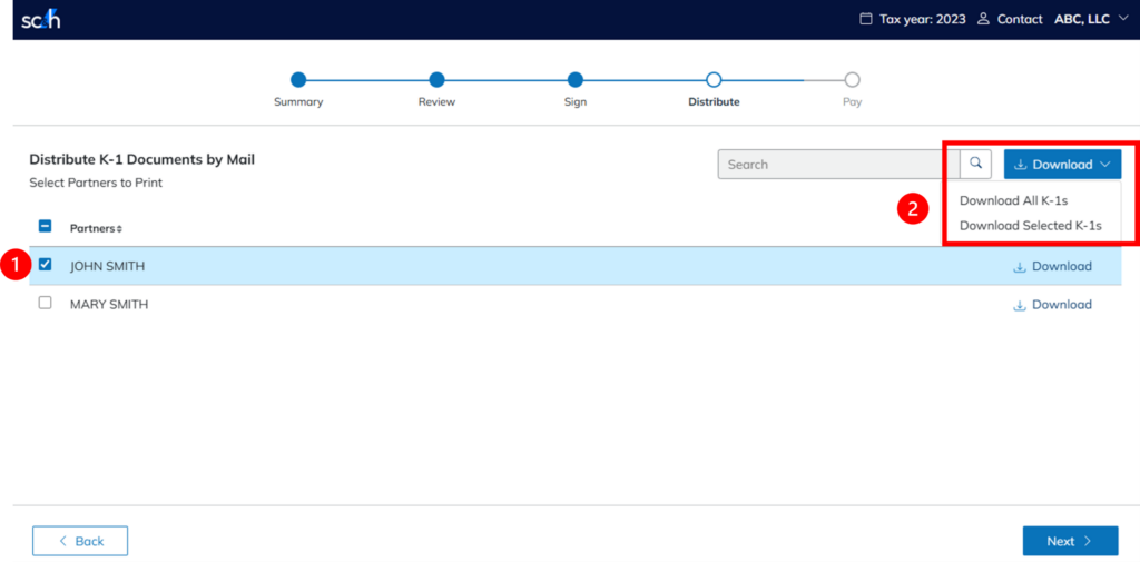 - Click Download to select how you would like to download the K-1s.