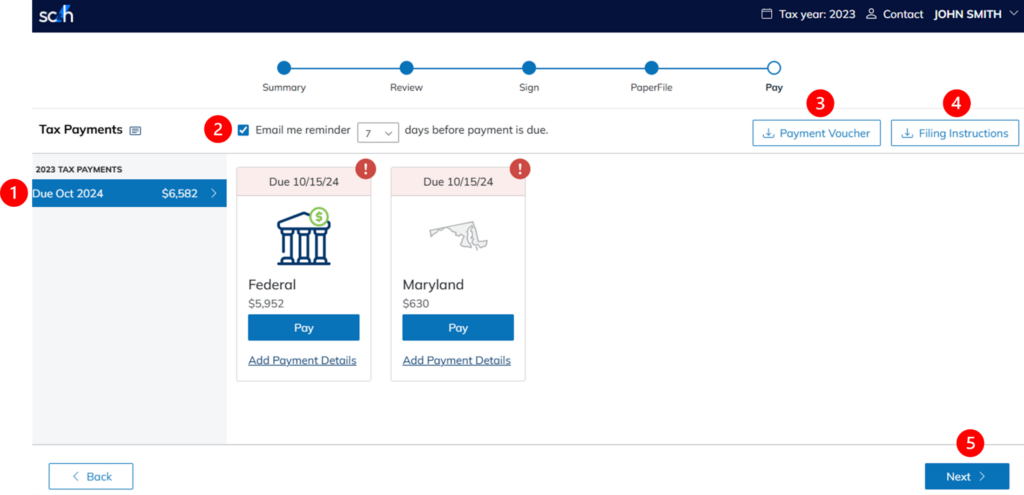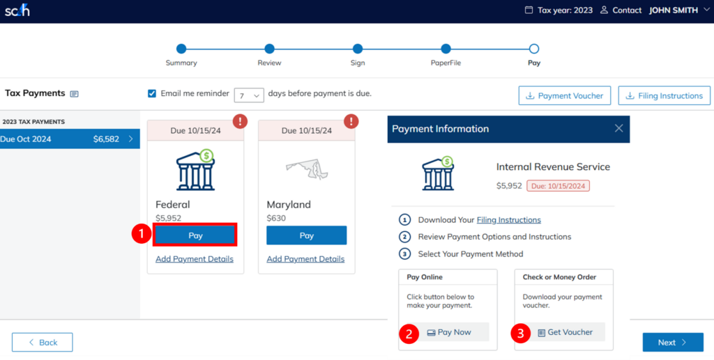 Estimated payments appear when you click Next. The options are the same for Tax Payment and Estimated Payments.