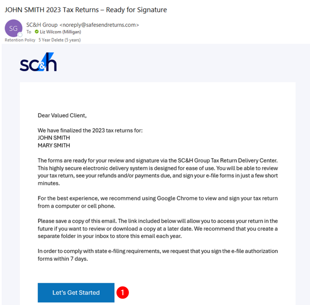 - You will receive an email from SC&H with a “from” address of noreply@safesendreturns.com with a safe link for you to access your tax return.