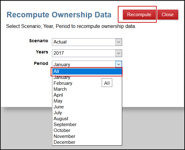 The application will prompt you to choose which Scenario, Years, and Period that will be recalculated. If changes were made across multiple periods, then select the All option by clicking on the drop down arrow next to period. Finally, click Recompute and refresh the database.