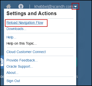 Finally, go back to the home screen and select the drop down next to the username in the top right corner. Then click Reload Navigation Flow for the changes to be added to the FCCS application.