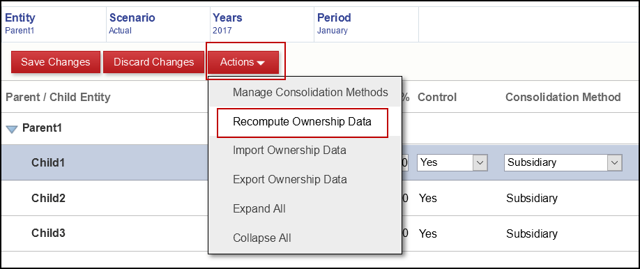 To apply the changes and see the effect on the data within the application, the ownership data must be recalculated using the new percentages. In order to do this, click on the red Actions drop down and then select Recompute Ownership Data.