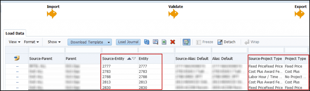 Once the Export is successful; open the Entity dimension in Smart View’s dimension editor, set the desired properties (parent and attribute most importantly), list out the entities, and refresh the worksheet to update the entities’ details. As shown below, the entity members were created under their coordinating parent, and assigned the Attribute (“Project Type”) are assigned as well.
