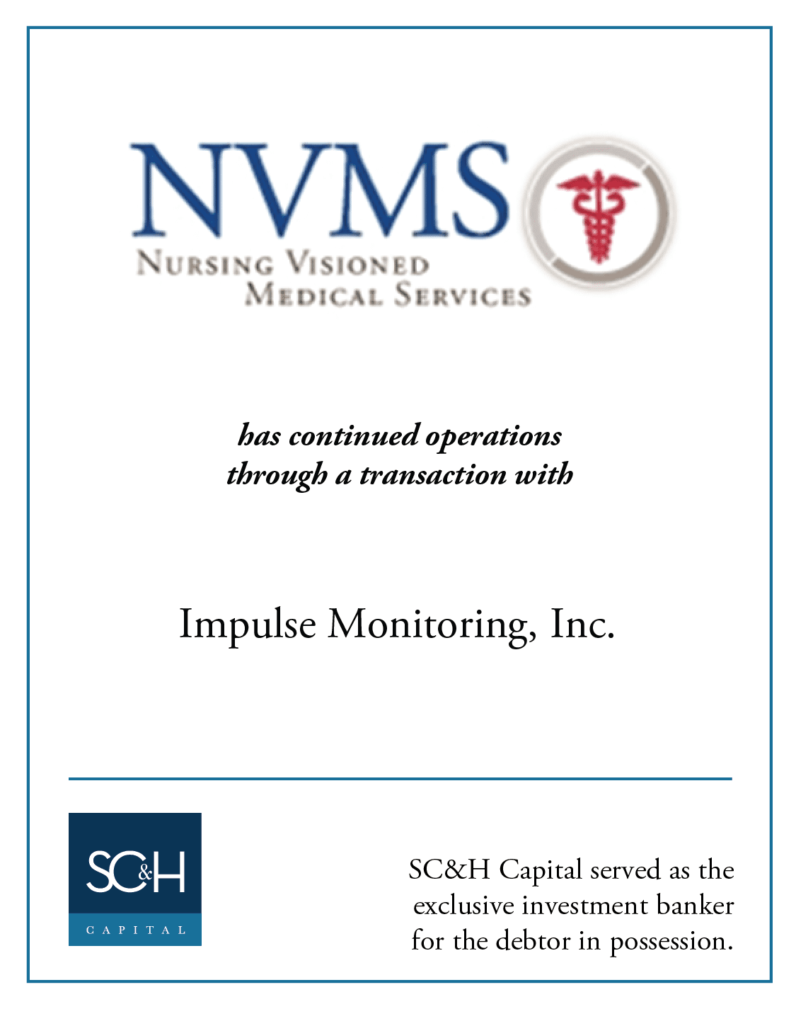 Nursing Visioned Medical Services, LLC (NVMS) – This Tennessee-based surgical support services company’s third-party billing agency failed, causing the bank to call the loans, and forcing the company to file chapter 11. The secured creditor did not believe the company had going concern value and was pushing for liquidation to at least recover some value from the assets. The owner/manager was desperate to avoid liquidation and continue operations despite the bank’s view. As a result, SC&H Capital was retained to explore a sale of substantially all of the company’s assets and the bank agreed to delay liquidation.